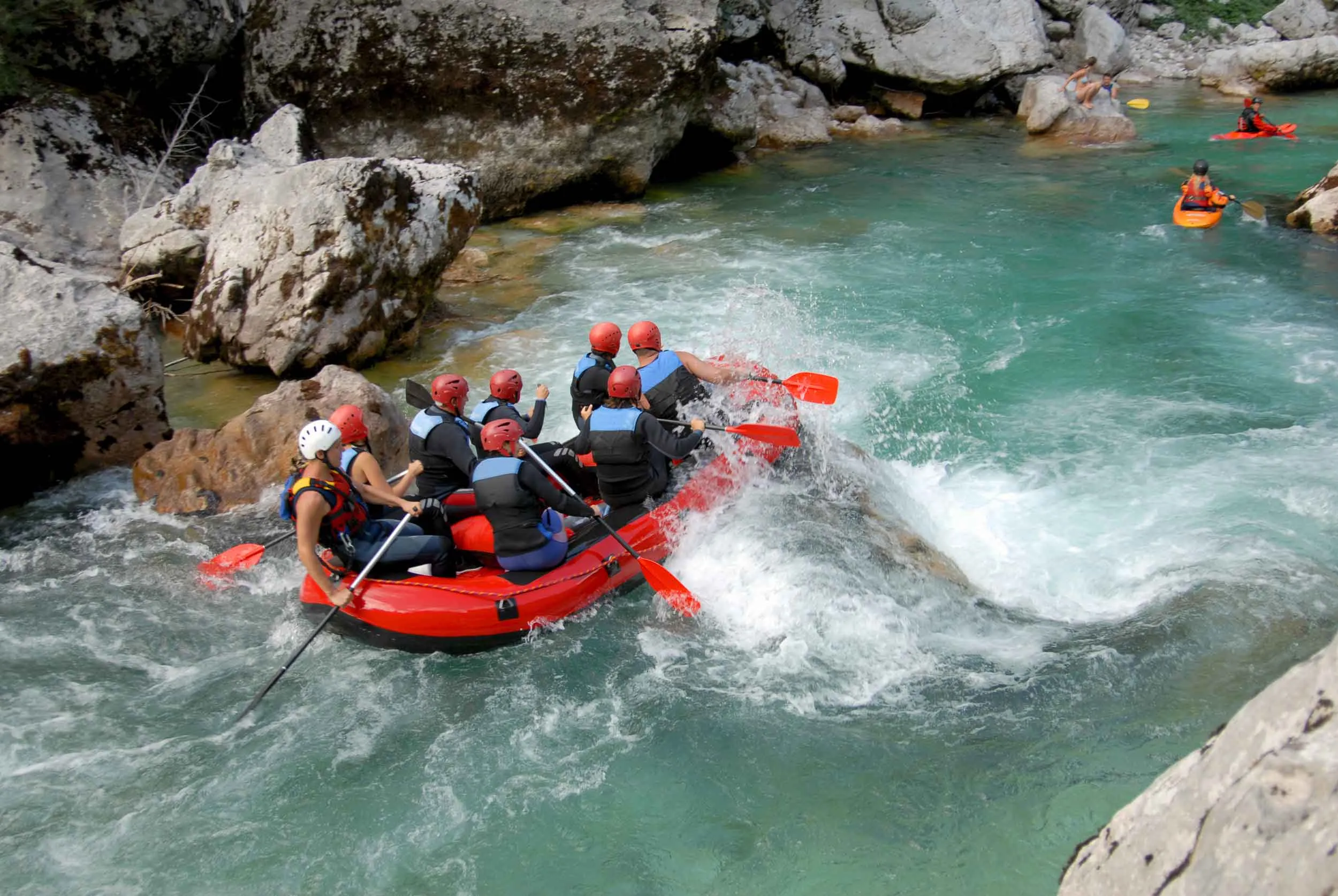 "Group of people navigating a rocky river, surrounded by rugged terrain."